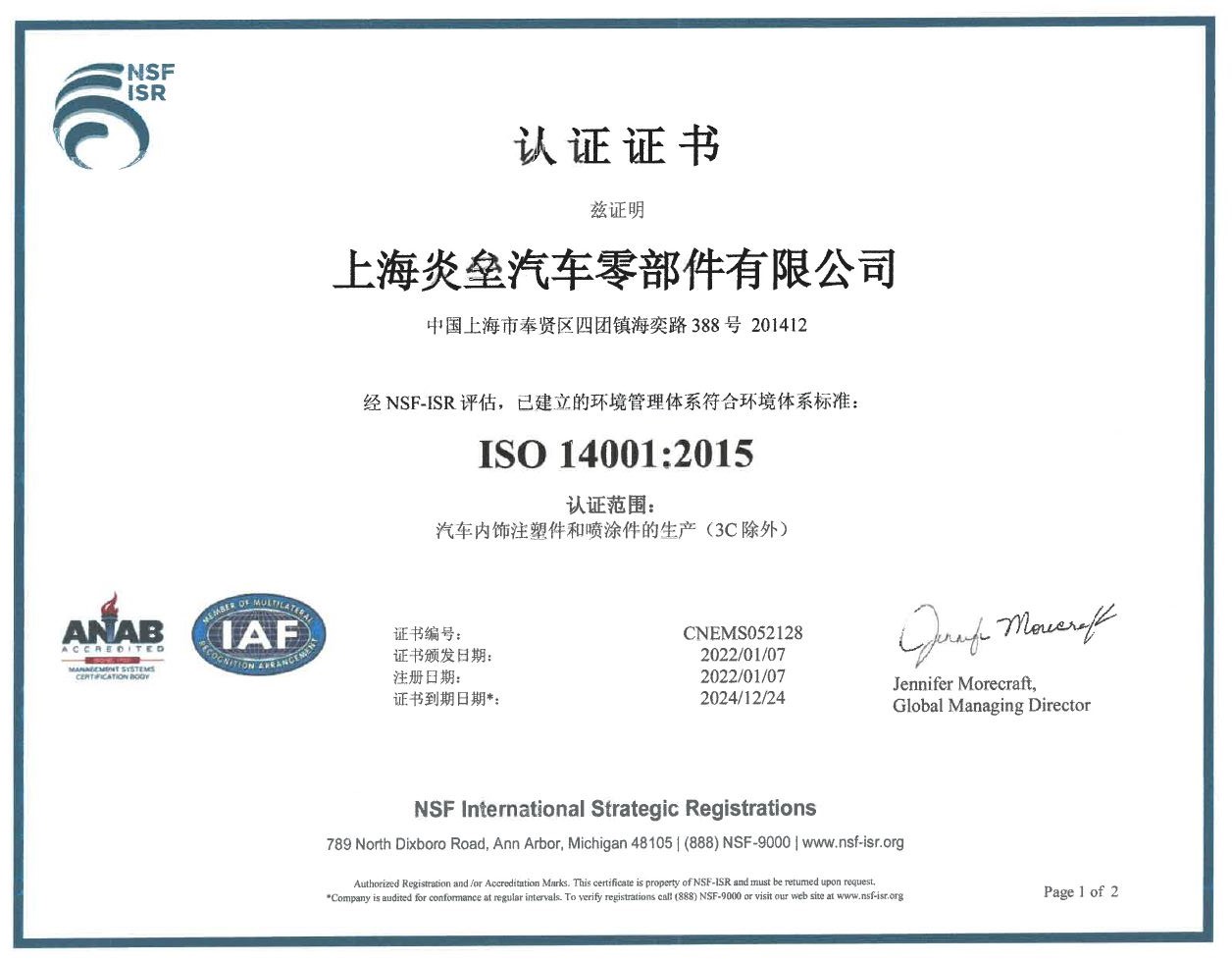 2018年12月份獲得了環(huán)境ISO 14001認(rèn)證證書